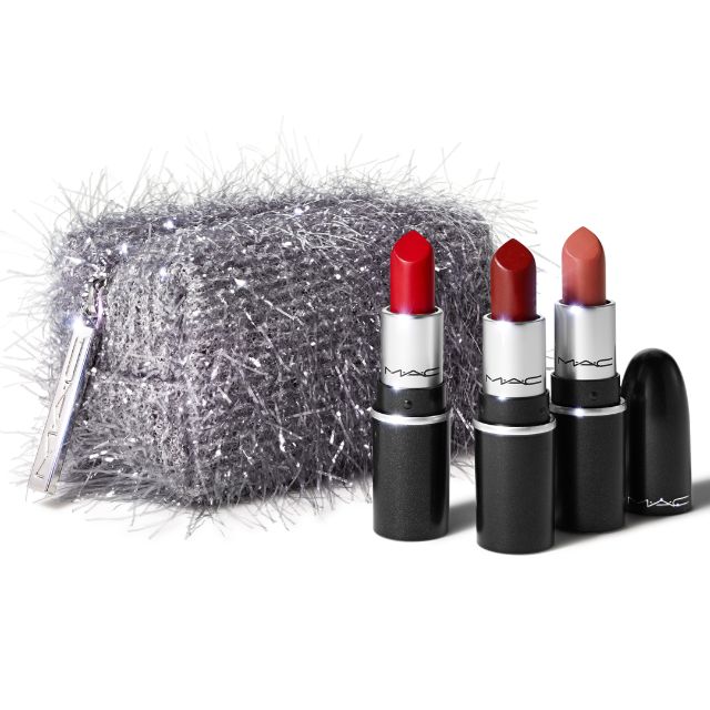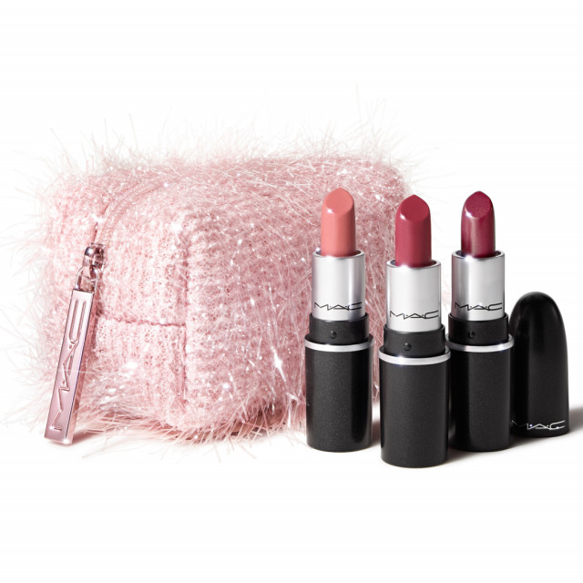 人気のリップスティックから、ホリデーカラー限定のミニサイズ3色をセット。「ピンク」は、ラスター質感のライトピンク、アンプリファイド質感のディープピンク、ダズル質感のパープル。「レッド」は、ラスター質感のブラウン、マット質感のダークローズとピンクブラウン。唇からホリデーシーズンを先取りして! 大容量のきらびやかなポーチも見逃せない。