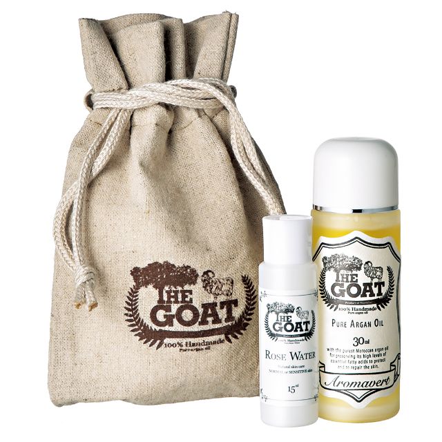 モロッコ産のアルガンオイルを原料とした100%オーガニックコスメブランド「ゴート」のコフレ。あらゆるエイジングサインにアプローチする高機能オイル(30ml現品)と、上品なダマスクローズの香りの化粧水(15ml)が巾着袋にイン。