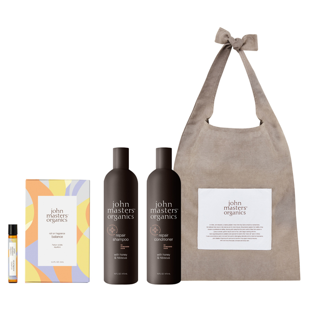 保湿力の高いハチミツやハイビスカス花水などの植物由来成分を贅沢に配合したジョンマスターオーガニックの人気ヘアケアシリーズH&H。乾燥はもちろん、カラーリングで受けたダメージヘアを内側から潤して補修。約3か月間たっぷり使えるビックサイズのシャンプー&コンディショナーがセットになったコフレです。セットになった今だけの限定ロールオンフレグランスやオリジナルエコバッグにも注目。