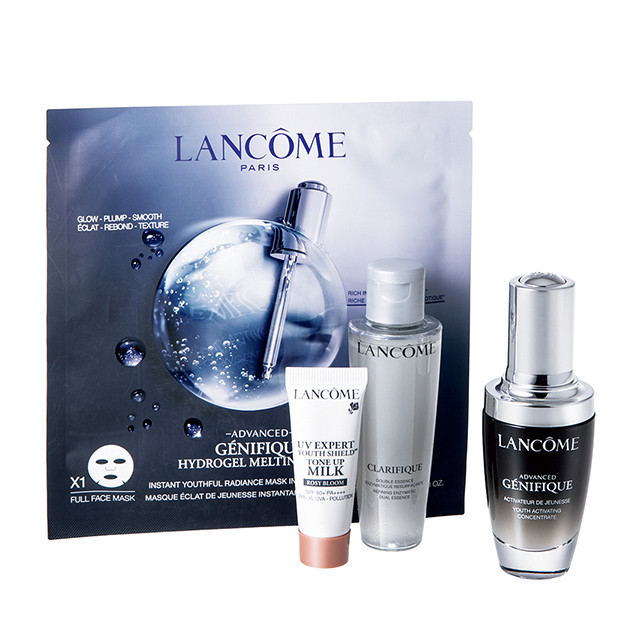 公式サイトはこちら6秒に1本売れているというブランドNo.1美容液「ジェニフィック アドバンスト N」。これの30mlor50mlを購入すると、透明肌を目指す“クラリフィック”シリーズの化粧水や、肌のトーンアップをかなえるUV乳液(各ミニサイズ)、シートマスク(1枚)がついてくるお得なキット。
