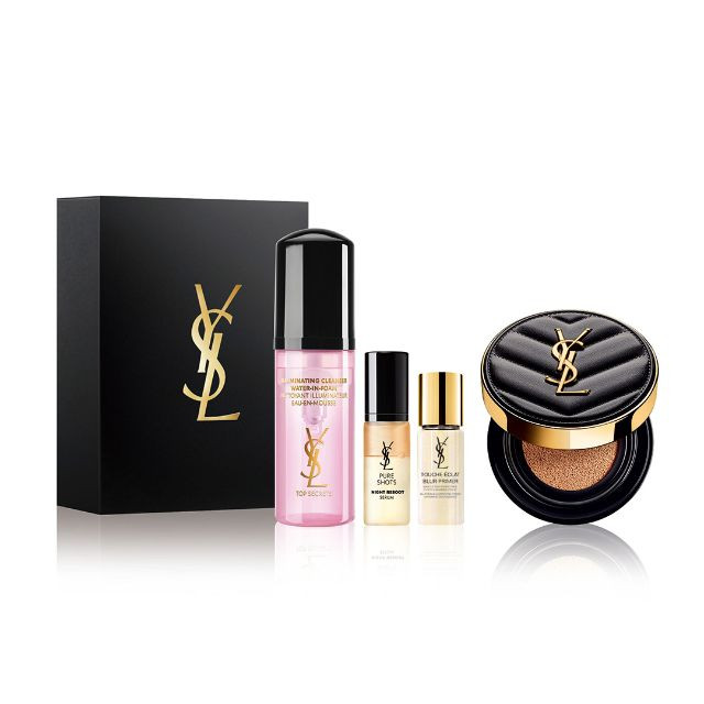 フィルターをかけたかのようなツヤ肌をかなえるクッションファンデーション「アンクル ド ポー ルクッションN」。これを購入し、¥550支払うと、夜用美容液(7ml)やプライマー(10ml)、泡洗顔料(50ml)がついてくる。