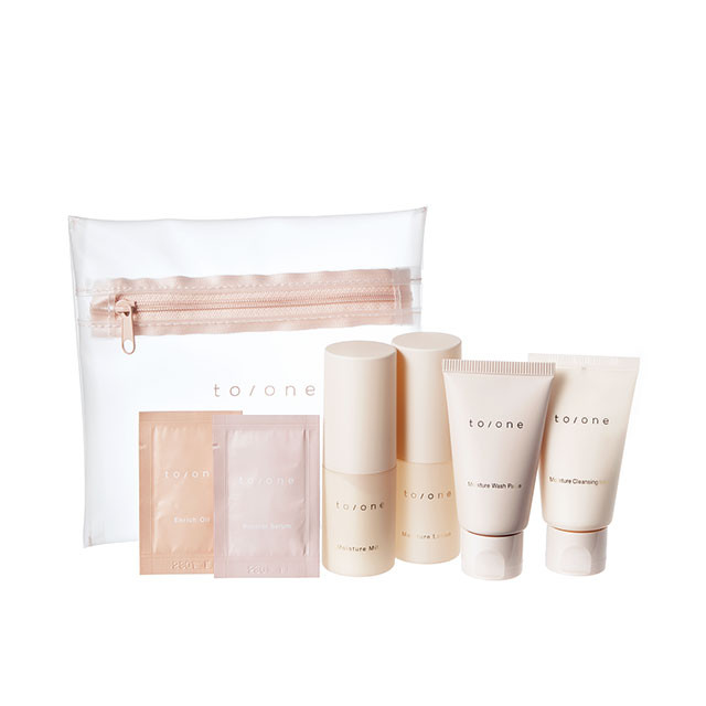 4月に発売したばかりのスキンケアシリーズのスターターキット。クレンジングミルク、洗顔料、ローション、ミルク(各ミニボトル)と、導入美容液・オイル(各パウチ)が、ポーチにイン。生命力あふれる植物エキスや海洋微生物由来原料などを配合し、ゆらぎを寄せつけない健やかな肌を育む。