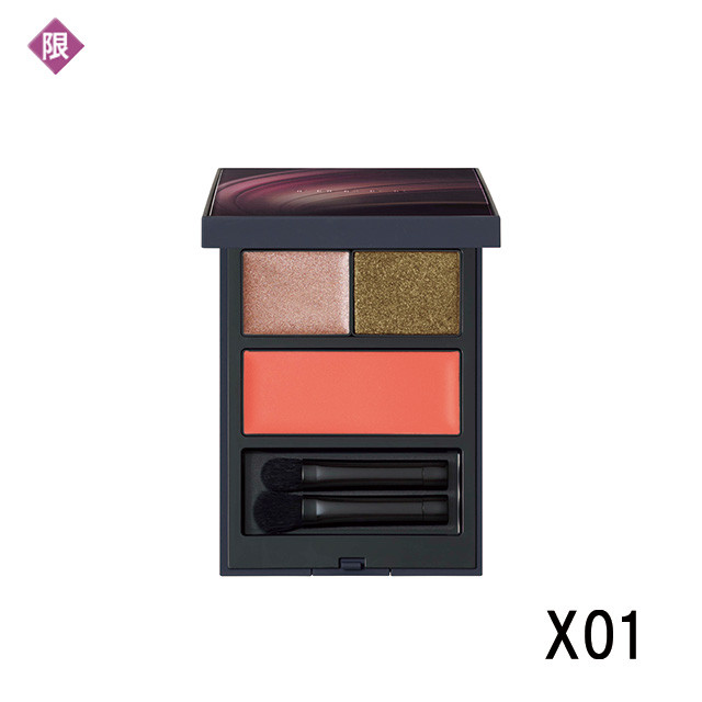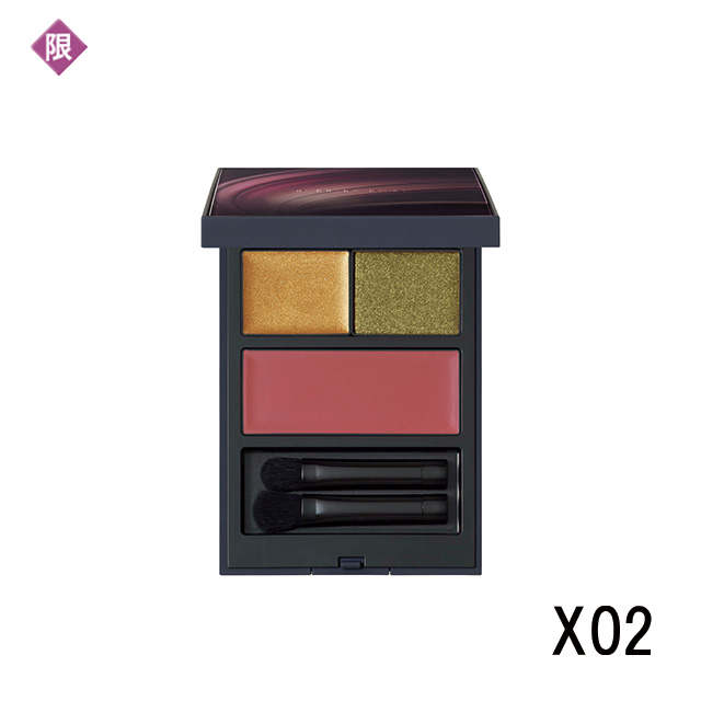 左上はクリームアイシャドウ、右上はパウダーアイシャドウ、下段はチーク。X02はカーキ&ゴールドアイカラー×レッドチーク。