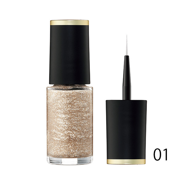 ネイルアートの幅がぐんと広がる、細筆のアプリケーターを採用。繊細ラインも大胆な太線も描きやすい。01はラメがきらめくゴールド。