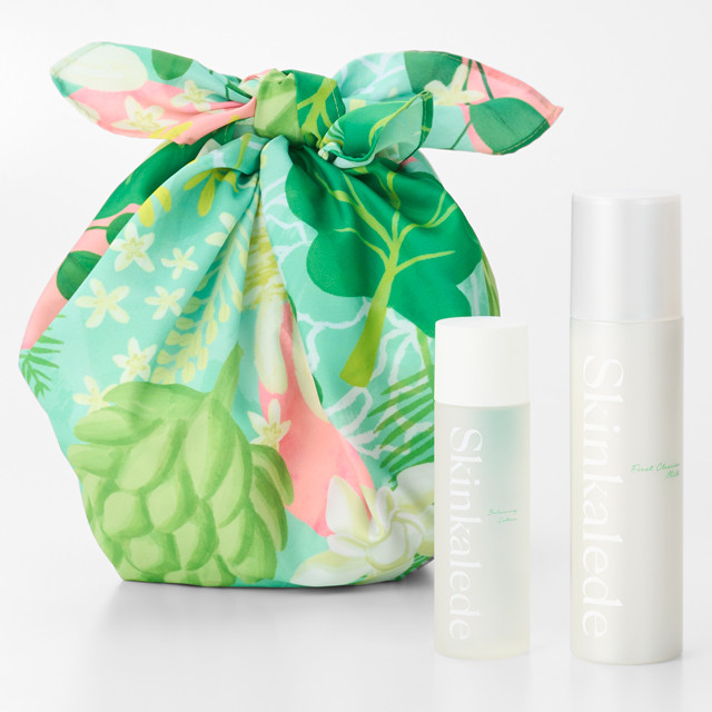 ポリフェノールやビタミンを含むケールから抽出された“ケール葉エキス”を配合した、先行型乳液と化粧水のセット。先行型乳液は、洗顔後に水分と油分を同時に補うことで、その後のスキンケアの浸透をサポートしてくれる人気のアイテム。フラワーアーティスト 前田有紀さんとのコラボで生まれたボタニカルモチーフの風呂敷もおしゃれ。