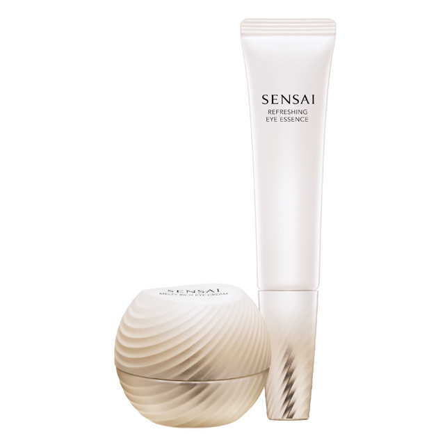 目元ケアに特化した美容液(20ml)&クリーム(15ml)がセット。右側は、ひんやりと冷たいアプリケーターとみずみずしいエッセンスで冷感ケアをかなえる美容液。じんわりとした温感効果をもつクリームは小ジワの隙間を埋めるように密着し、美容成分を肌内に閉じ込める。
