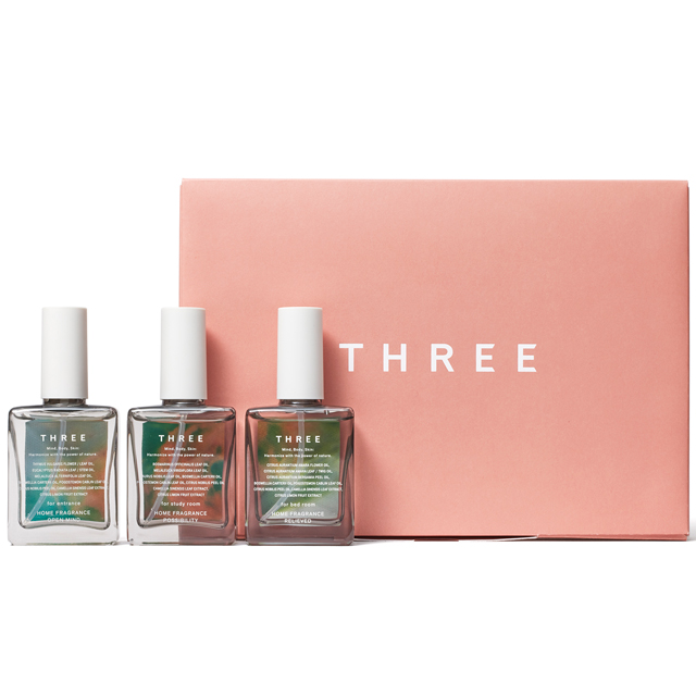 THREEから3種のホームフレグランスをセットにしたコフレが登場。リビング、書斎、寝室とそれぞれにぴったりな天然精油を配合した3種類の香り。ハーバルグリーンが爽やかに香る「オープンマインド」は、エントランスやリビングなど人が集う場所に。ローズマリーやローレルなど、スッキリと香る「ポッシビリティ」は、集中力を高めたいスタディルームやリモートオフィスに。ベルガモットに落ち着きのあるネロリをプラスした「レリーヴド」は、一日の疲れを癒す寝室に。空間に溶け込んでいく精油の穏やかな香りを満喫して。