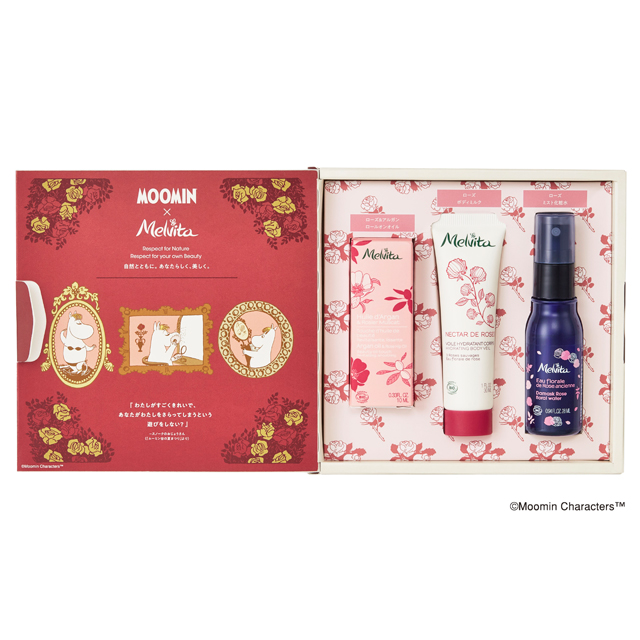 人気のローズアイテムをセットした、絵本のようなパッケージが特別感のあるコフレ。「フラワーウォーター リセットミスト」はひとふきでみずみずしい肌に導くとともに、リラックス&リフレッシュ効果も。ミニサイズで、持ち運びにも便利です。©Moomin Characters™