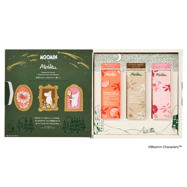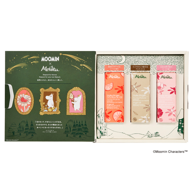 ロールオンタイプのアルガンオイル3種をセットに。目元や口元、指先、毛先など乾燥が気になる部分を手軽にケアでるから、常にしっとりとした潤いをキープできます。その日の気分で香りを変えて楽しめる! ホリデーシーズンならではのお得感を堪能して。©Moomin Characters™