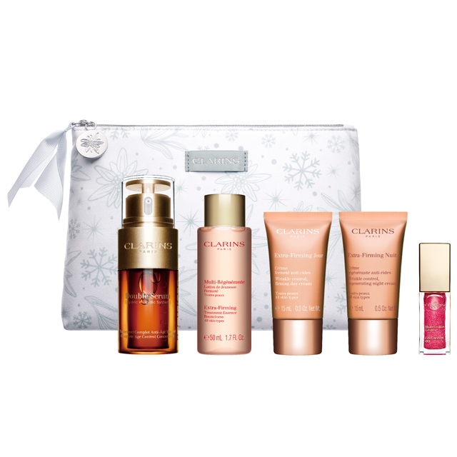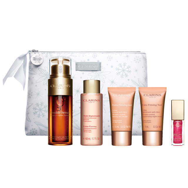 クラランスの人気No.1美容液「ダブル セーラム」の現品(30ml・50mlから1品選択)をメインにした、エイジングケアコフレが登場。「ダブル セーラム」は、20種類以上の植物由来成分を配合し、オイル×ウォーターのダブルフォーミュラで肌を引き締め、ハリと弾力を与えるエイジングケア美容液。セットでついてくるのは、肌にハリを与えるエイジングケアシリーズ「ファーミングEX」の化粧水、日中用&夜用クリームの3点。さらに、みずみずしく唇を潤しながら鮮やかな発色をかなえる人気のリップオイルの現品もセットに。雪の結晶が描かれたポーチも今だけの限定デザインなので、お見逃しなく!