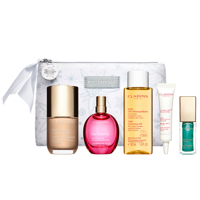 クラランスのファンデーションの中から好みのアイテム(現品)を選ぶと、ベースメイクアイテムのミニサイズがついてくるキットがお目見え。写真の「エヴァー ラスティング ユース フルイド」は、高いスキンケア効果とメイクアップ効果を兼ね備えたハイブリッドのリキッドファンデーション。セットでついてくるのは、化粧くずれ対策として大人気の「フォックス ミスト」やクレンジングオイル、UVクリームなど。ベースメイクのクオリティをぐっと高めてくれるアイテムが揃うキットです。