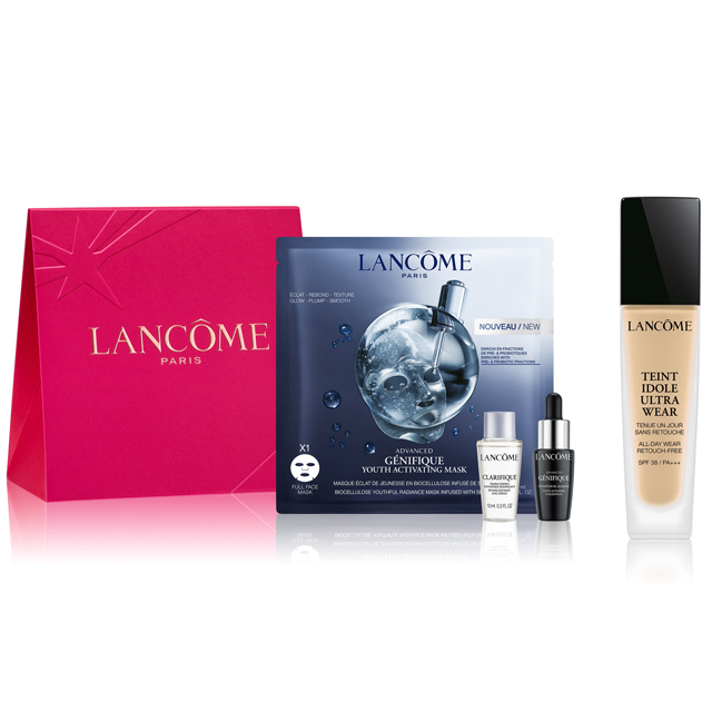 好みのファンデーションを購入すると、人気の美容液や化粧水、シートマスクなどの試供品がセットになるお得なキット。おすすめは「タンイドル ウルトラウェア リキッド」。カバー力がありながら厚塗り感がなく、美しい仕上がりが続くと人気のリキッドファンデーションです。