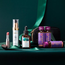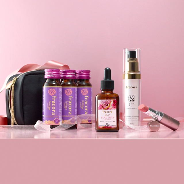 従来の「プラセンタエキス原液」よりもアミノ酸量を3.3倍に増量した美容液「ディーププラセンタエキス原液」の現品に加え、30種類の美容成分をたっぷり配合したオールインワンドリンク「フラワージュ クレミアム」などをセット。内側から透明感のあふれる肌へ導きます。ほんのり色づくティントリップも、マスクメイクに重宝間違いなし。