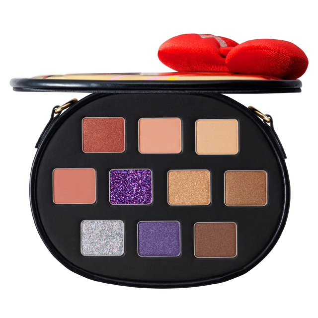 ゴールドに輝くキティの顔を開けると、東京のナイトシーンにインスパイアされたアイカラーがズラリ。10色のうち、6色が限定! 注目はミラーボールのように立体的に輝くグリッターカラー。ホリデーシーズンのメイクを華やかに彩って。