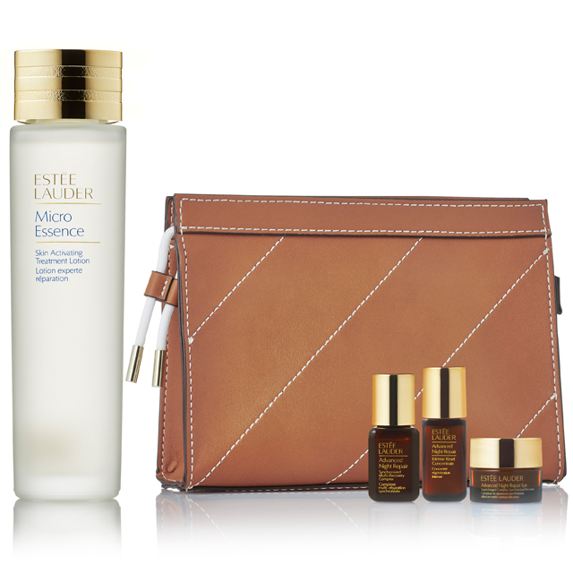 肌の防御力&修復力を高めて土台から強くする大ヒット化粧水「マイクロ エッセンス ローション」、または日本の桜由来の発酵成分を配合した「同 フレッシュ」の現品に、ベストセラーシリーズ「アドバンス ナイト リベア」のフルライン3品のスペシャルサイズをセット。併せて使えば乾燥知らずのしっとり肌に。シンプルなブラウンカラーのポーチ付き。