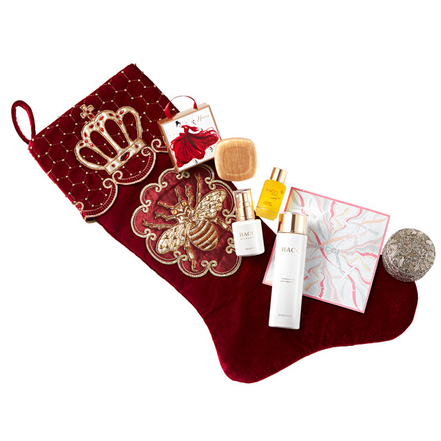 洗顔〜オイルまで、スキンケアアイテム一式を詰め込んだ贅沢なコフレ。人気の化粧水「ハニーローション-HINKAKU-」は、現品サイズがイン。とろみのある濃密なテクスチャーが、輝くようなツヤ肌へと導きます。幸せを呼ぶミツバチが施された、インパクト大のビックサイズソックスは、ホリデーシーズンのインテリアにぴったり。