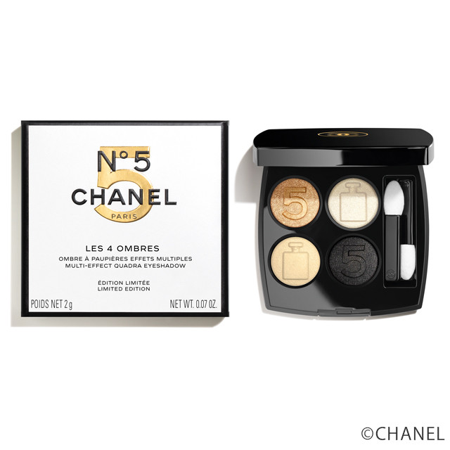 2021年ホリデーコレクション限定で「N°5」をイメージしたアイシャドウパレットが登場。きらめくアンバーやホワイト、パーリィなアイボリー、マットブラックの4色。単色で使っても、重ねてブレンドしても華やかな仕上がりに。それぞれのカラーの表面に、「N°5」のモチーフが刻印された、コレクターズアイテムと呼ぶにふさわしい一品です。