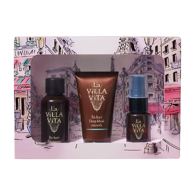 「リ・ヘア」シリーズのシャンプーとトリートメント、ヘアミストのミニサイズをセットに。髪のダメージを深層から補修するヘマチンや、頭皮に栄養を与えるリンゴ果実培養細胞エキスを配合し、しなやかなサラツヤ髪に導くシリーズ。3点を収納できるポーチ付きで持ち歩きにも便利。パリの街並みをイメージした限定デザインのボックスもキュート!