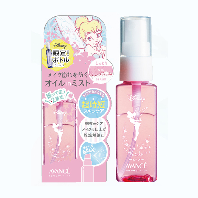 メイクの上からスプレーするだけで、メイクくずれやマスクへのメイク移りを防止する、アヴァンセの人気オイルインミスト。キュートなティンカー・ベルとのコラボパッケージが、ホリデー限定で登場。ウォーターセラムとオイルの2層式で、水分の蒸発による乾燥を防ぎます。グリーン色ボトルのさっぱり引き締めタイプは、メントール配合で仕事中の気分転換におすすめ。ピンク色ボトルのしっとりうるおいタイプは、暖房による乾燥からも肌をしっかりと守ります。