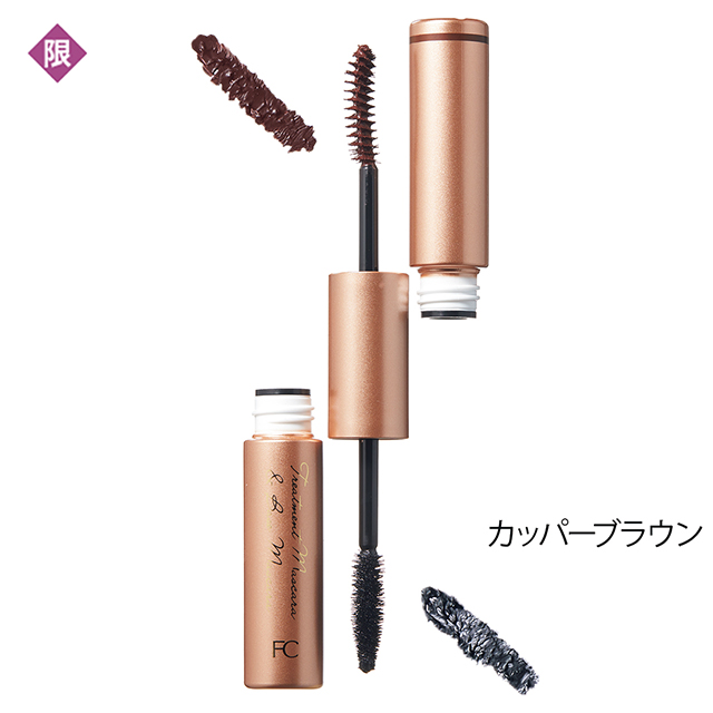 トリートメント効果のあるマスカラベース(下)でまつげを整え、カッパーブラウン(上)を重ねると柔らかな目元に。