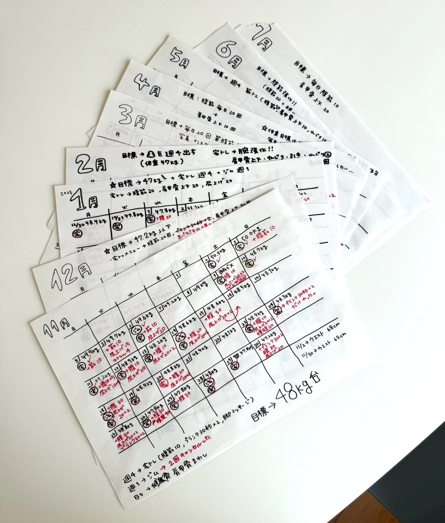 カレンダーにその日クリアすべき最低限のメニューを記入していました。例えば『腹筋を10回する』『肩甲骨の上げ下げを10回する』とか。どれも無理のないトレーニングなので手軽に続けられるし、習慣化しやすい。
