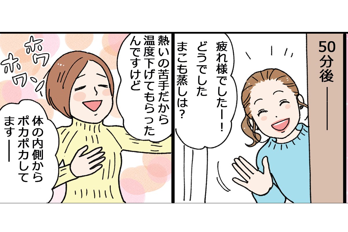 「予想以上に心地よく、効率的に体が温まるところが最高!肌ケアも一緒に楽しめちゃったので、お肌が血色良くピカピカ♡ 翌日以降の体&肌の調子も良かったので、定期的に通いたいですー!」