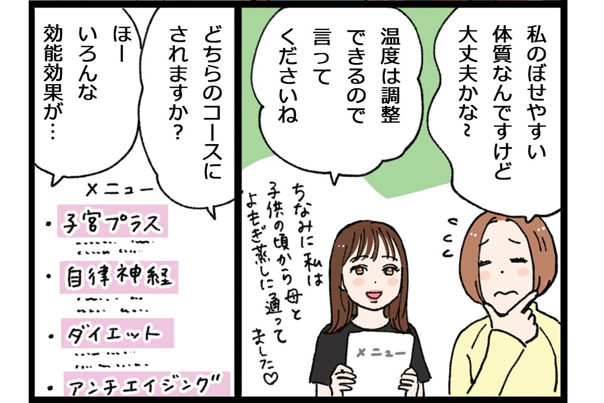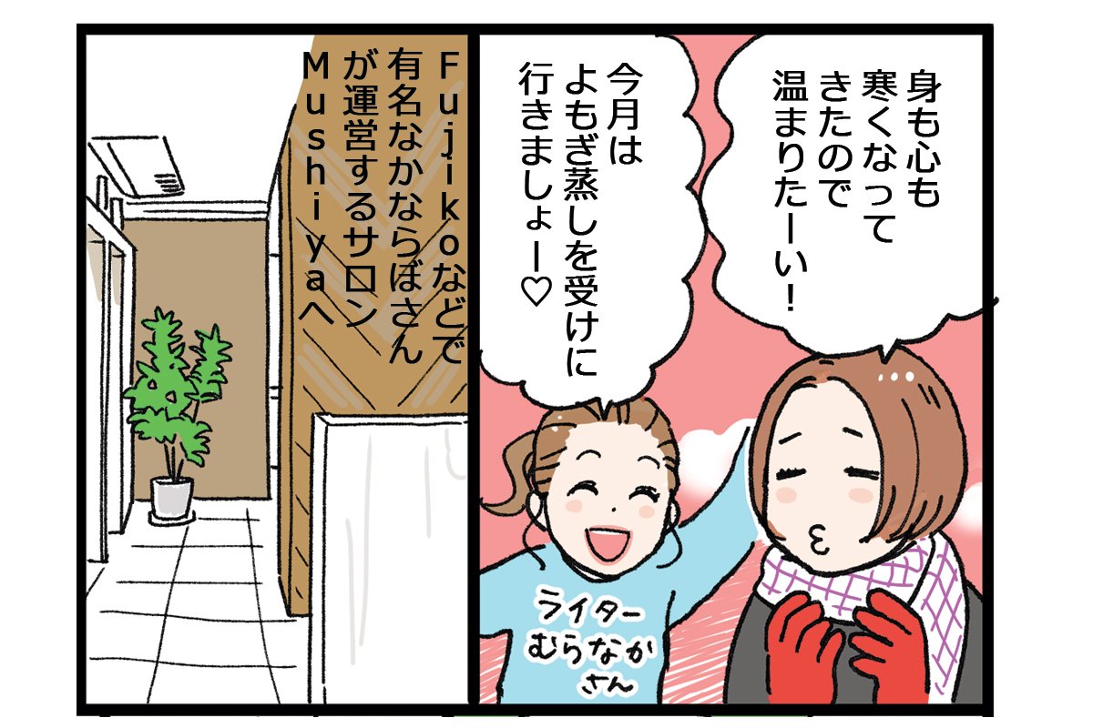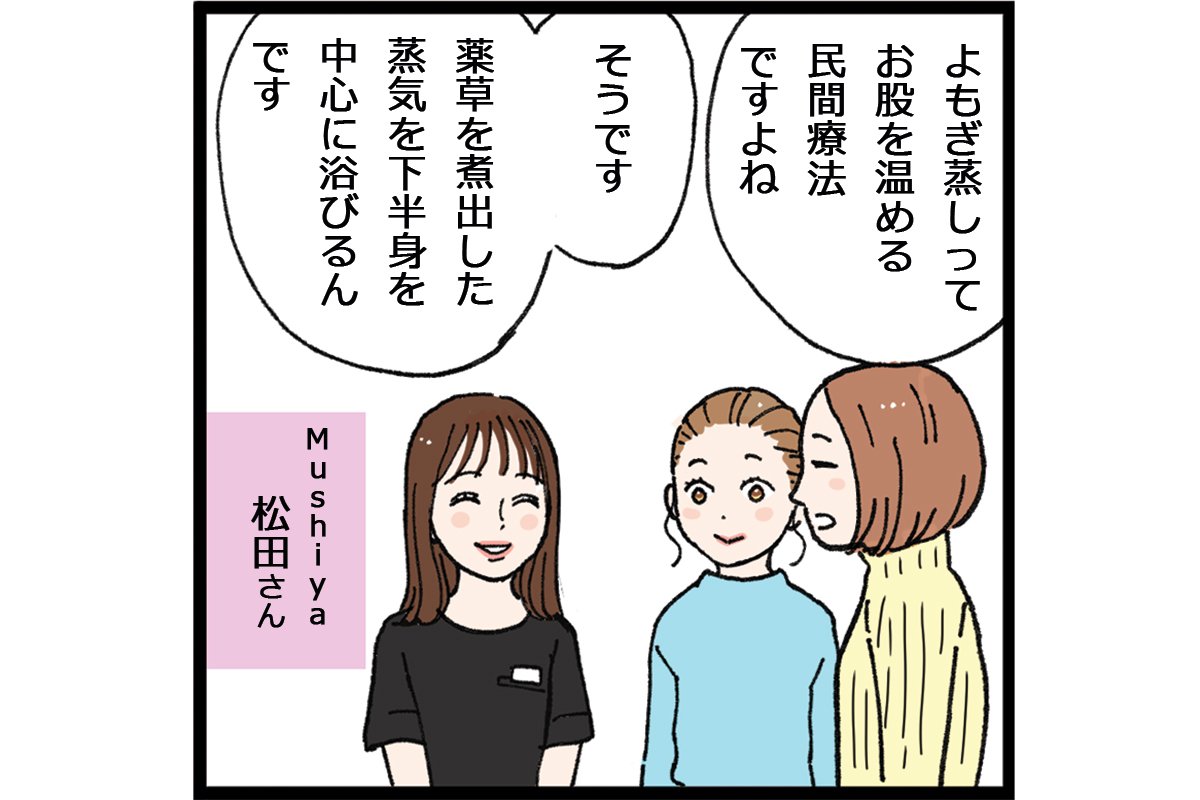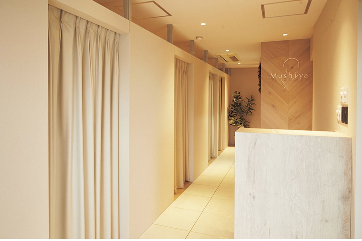 体だけでもポカポカにしよう! ということで、よもぎ蒸しサロン『Mushiya』へ。子宮や自律神経にアプローチする漢方よもぎ蒸しや、更年期にうれしいアンチエイジングブレンドなど、魅力的なコースがたくさん!