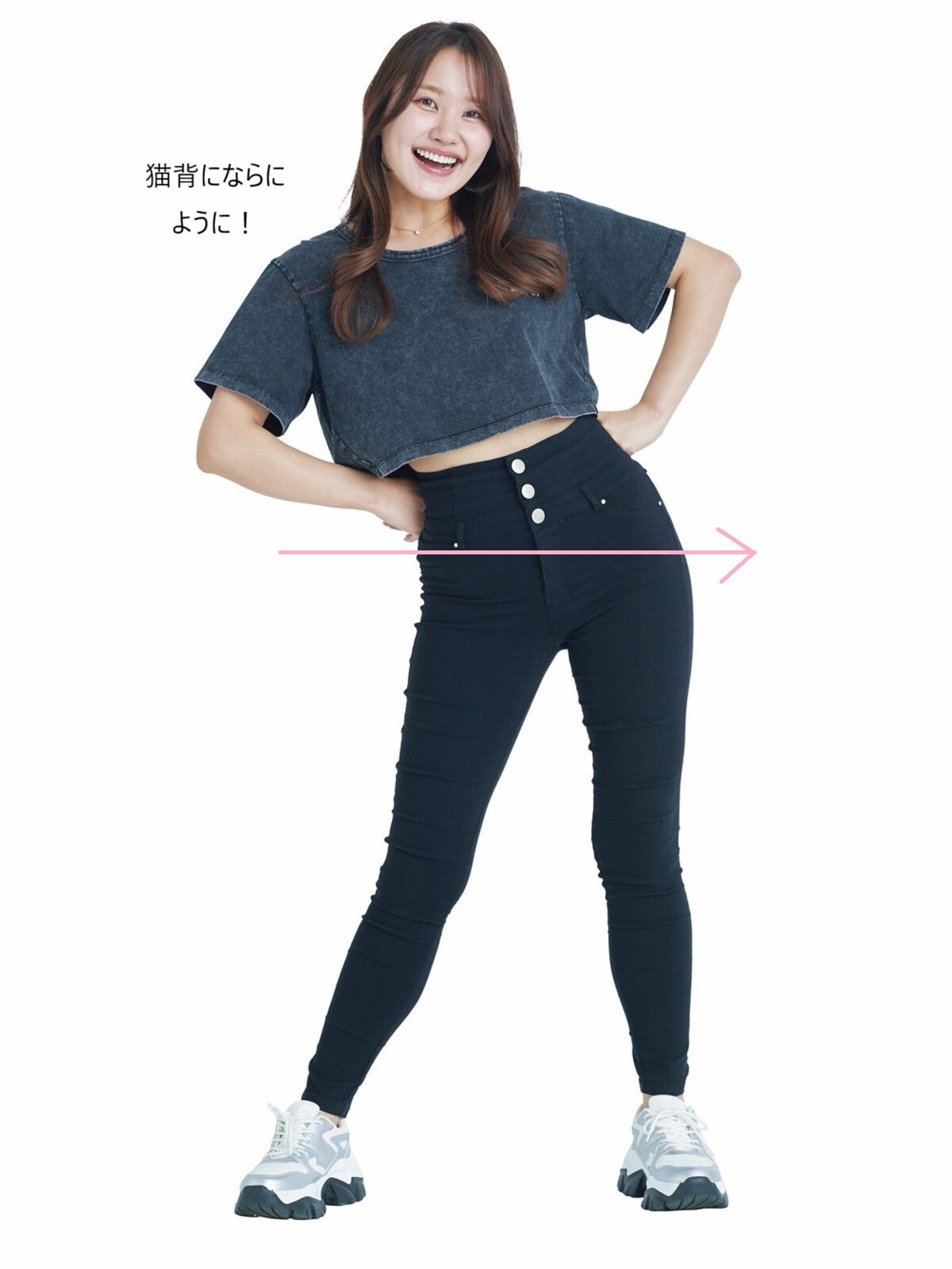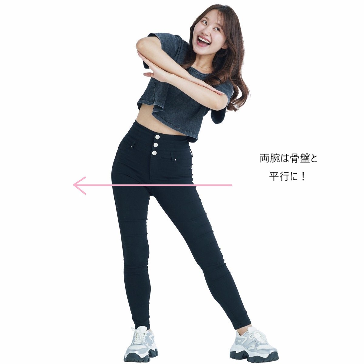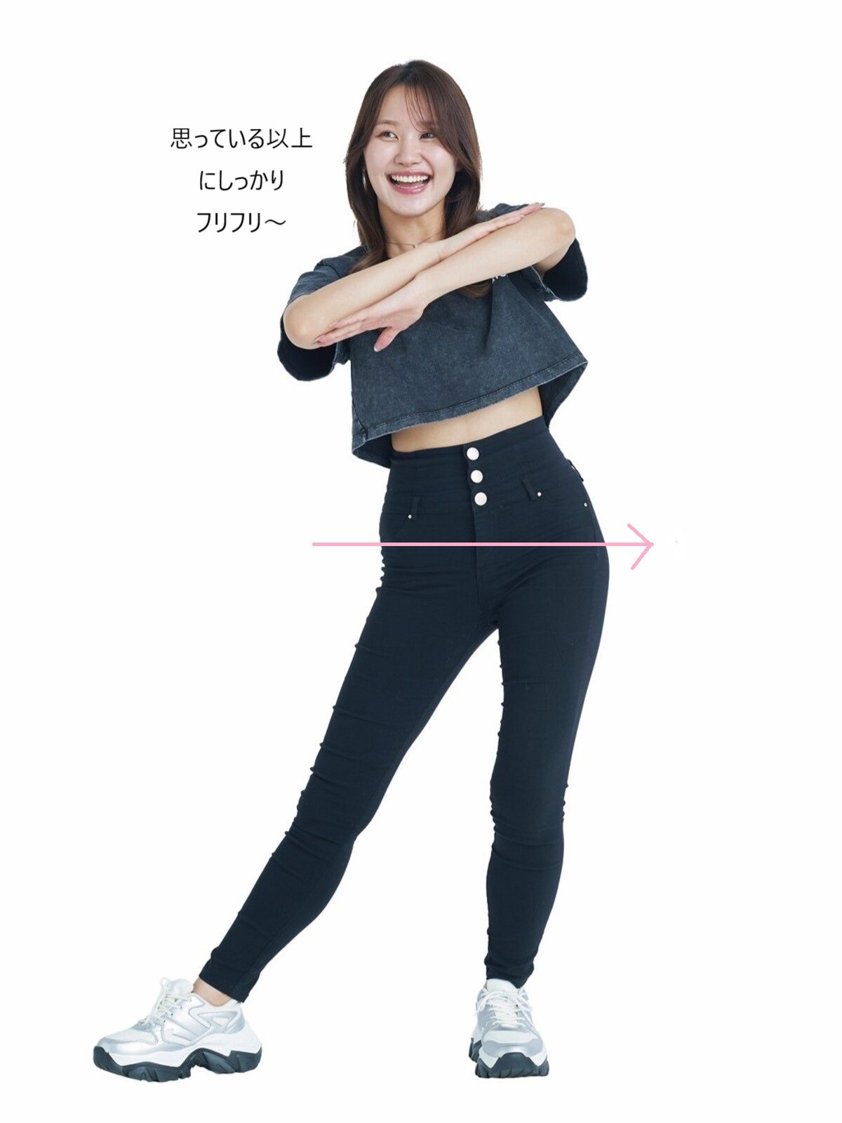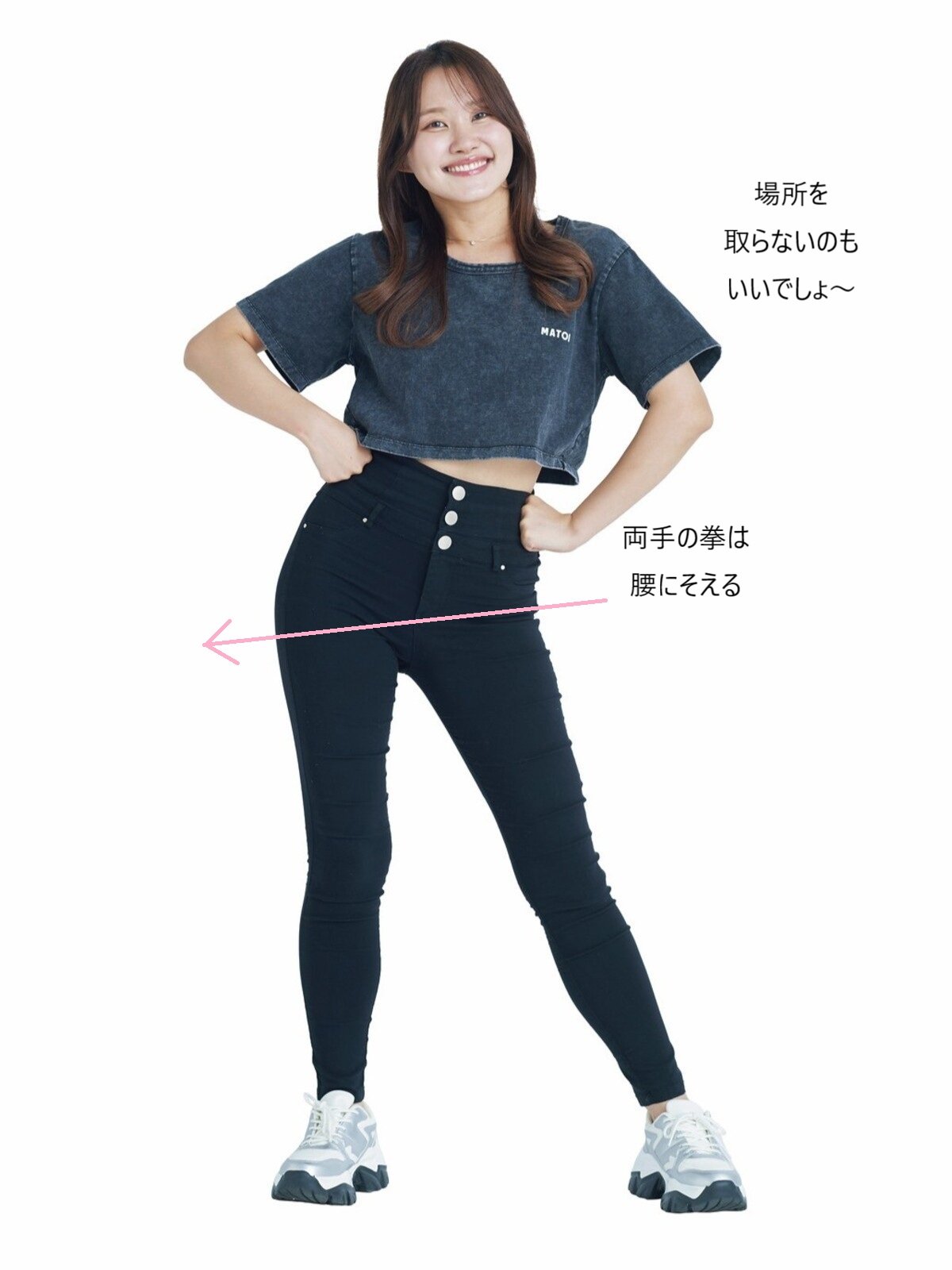 背筋とひざをまっすぐ伸ばした状態で、テンポの良い曲に合わせて大きく腰を左右にフリフリさせる。猫背にならないよう気をつけて。最初は拳を左右の腰に当てたまま、30秒間しっかりとフリフリさせて。
