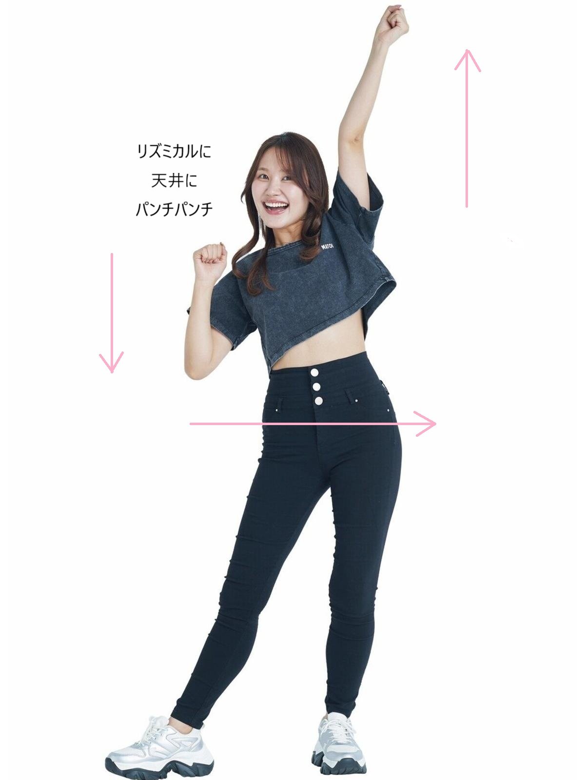 片手を上に突き上げると同時に片方の腰を振るという動作を左右交互に30秒間、全力で行って。これによって、腕も背中もおなかもヒップも脚も、とにかく全身の筋肉が引き締まっていく。終わった後は、気持ちまでスッキリ☆