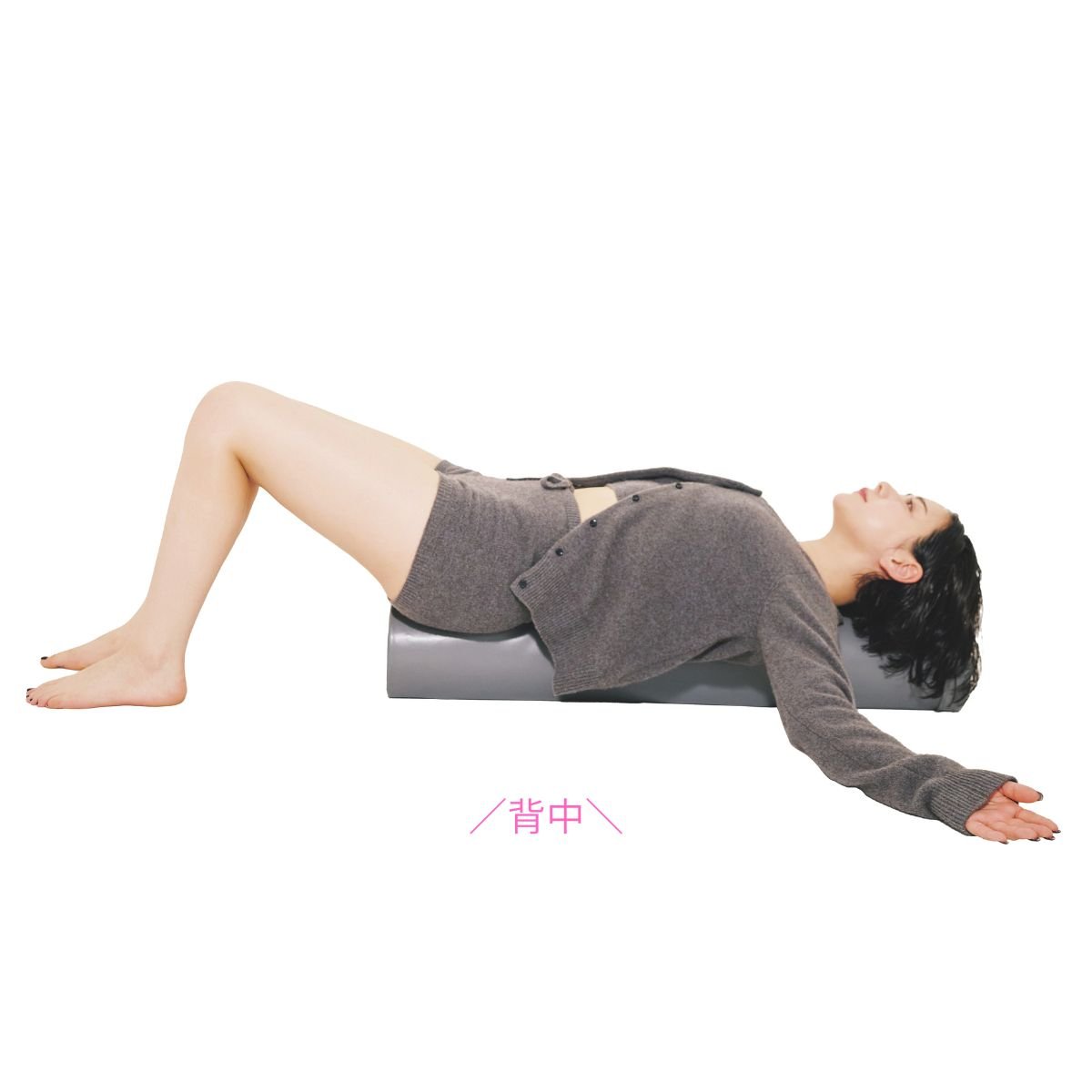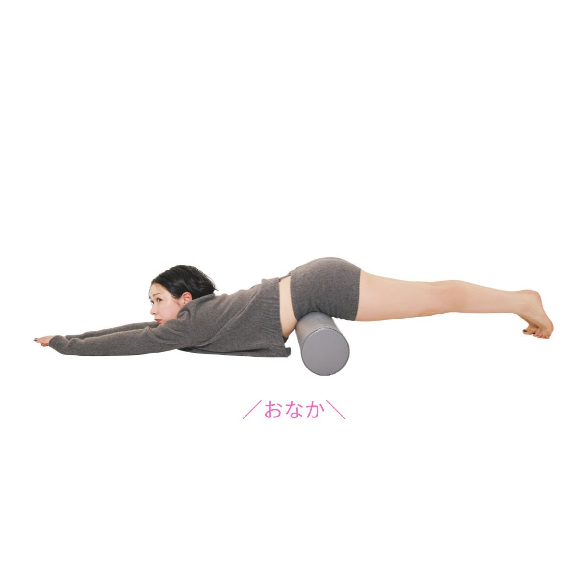 外ももや前もも、おなかをストレッチ用のポールに乗せてコロコロ転がして張り感をほぐす。おなかほぐしは便秘予防に。ポールの上に寝転び、深呼吸をしながら腕を上下に動かすと肩胛骨のコリ解消にも。