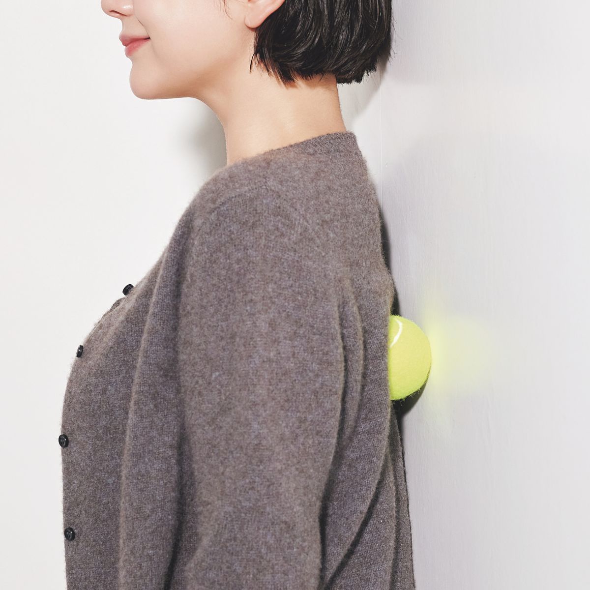 「バッグに必ずテニスボールをひとつ携帯していて、移動中の新幹線や待ち時間に、お尻の下や肩胛骨にボールを当てて、ぐりぐりとほぐしています。これをしておくと疲れの取れ方が違うんですよね」