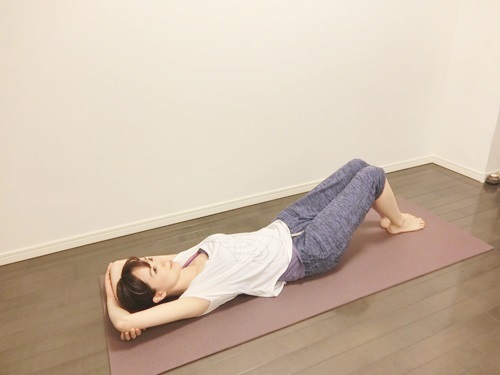 (1)仰向けになり頭の上で肘同士を持ちます。背中はべったりと地面(床)につけ、膝と股関節を直角に曲げておきます。