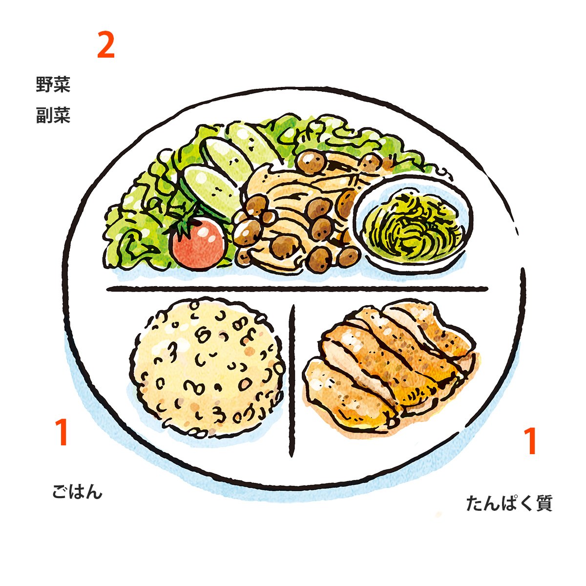 - 2(野菜・副菜):1(たんぱく質):1(ごはん)