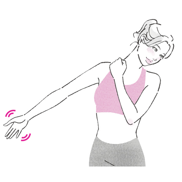(1)背筋を伸ばし、右手の指4本(親指以外)を左の鎖骨の下に当て、左右に小刻みに動かす。イタ気持ちいいと感じる強さで1分程もみほぐした後、手を入れ替えて右側も行う