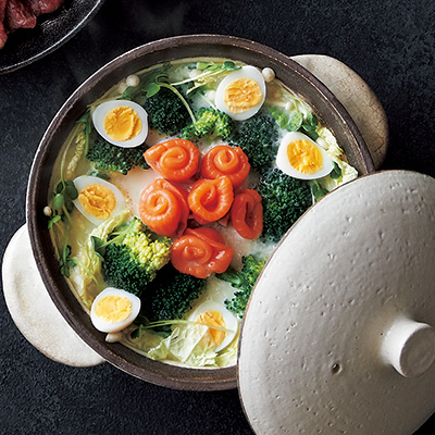 (1)鍋にだし汁とAを入れ、くるくると巻いて(巻き始めはきつめに、だんだん緩く巻くのがポイント)バラ形にしたサーモン、下ゆでしたブロッコリー、食べやすい大きさに切った白菜、えのきだけ、貝割れ大根、ゆでて半分に切ったうずらの卵を入れる。