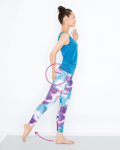立って背筋を伸ばし、腰に両手を置いて骨盤が床と垂直になるよう確認しながら脚を前後に開く。前脚ではなく、後ろ脚のひざをゆっくりと曲げて床に近づけるようにして、後ろ脚の股関節をストレッチ。これを左右各3〜5呼吸行えば、基本エクササイズは完了。