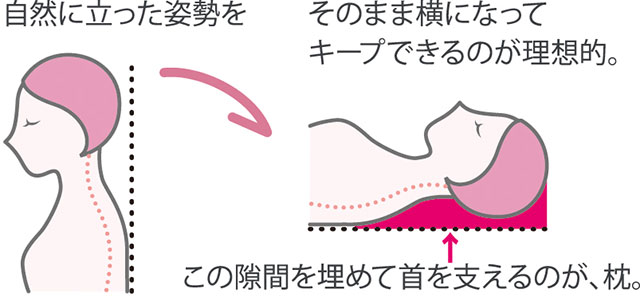 睡眠中も、まっすぐ立ったときの姿勢がそのまま寝具の上で保たれている状態が理想的。そのときに敷き寝具と後頭部~首の後ろにできる隙間がまくらの高さの目安です。まくらを使わないと首や肩に力がかかってしまい、高すぎるまくらを使うと猫背になりやすく首にしわができてしまう可能性が!