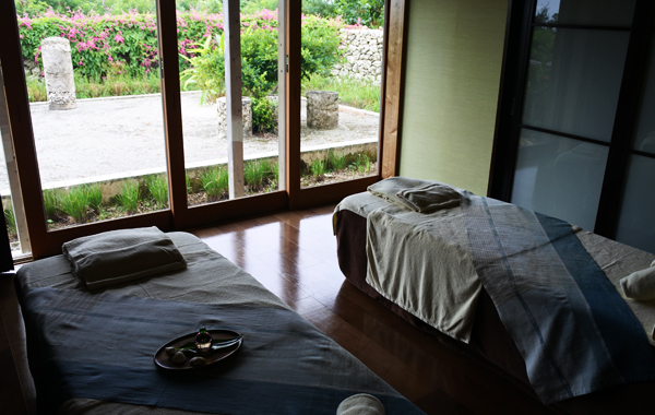 「星のや竹富島」の敷地の端にあるスパの館は、心地いい海風が流れる南向きの部屋で、庭をのんびりと眺めながら施術を受けられる造り。琉球赤瓦の屋根から、守り神シーサーが訪れる人を温かく迎え入れてくれます。