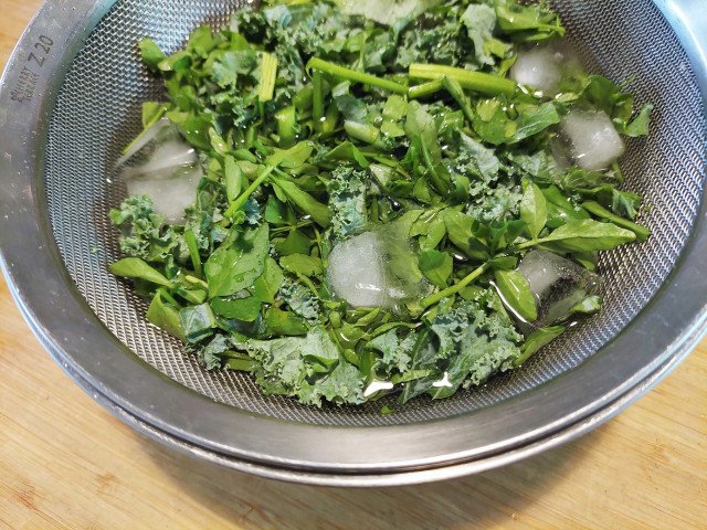 (1)緑の葉野菜は食べやすい大きさに切り、氷水に10分程浸しシャキッとさせる。