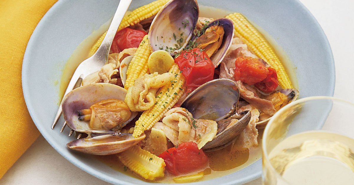 トマトやアサリのだしが豚肉にぎゅっと染み込み、うまみがたっぷり。女子会やホームパーティなど、華やかな食卓にしたい日に作りたい。
