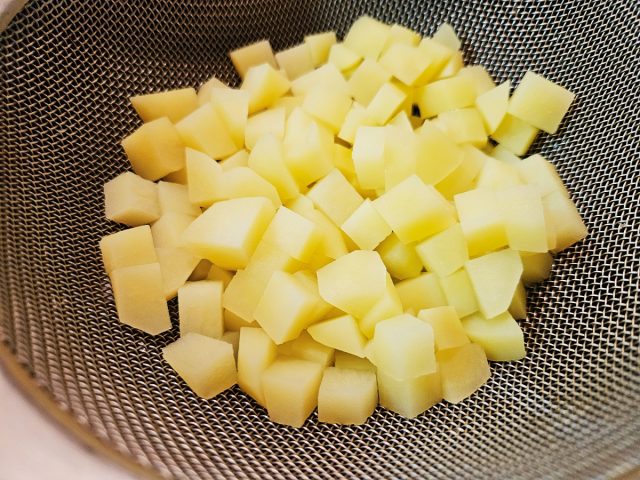 (1)じゃがいもは約8mm角に切り、水とともに鍋に入れ、ゆでて柔らかくする。やや食感が残る程度でざるにあげて水気をきる(今回はマッシュするポテサラではないので、柔らかくなりすぎないよう注意)。