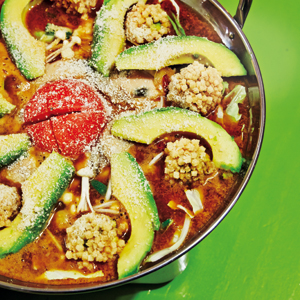 11月に3店舗目を下北沢にオープン。コースでオーダーできる、冬の名物・アボ牡蠣鍋は、とろとろのアボカドとカキのうまみが凝縮した赤みそスープが絶品。野菜はお代わり自由。アボ牡蠣鍋コース(飲み放題つき)¥4,980