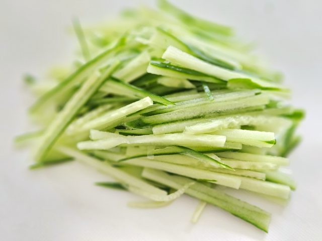 (1)きゅうりはへたを切り落とし、千切りに。