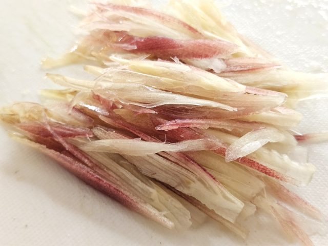 (2)みょうがは縦に細切りに。