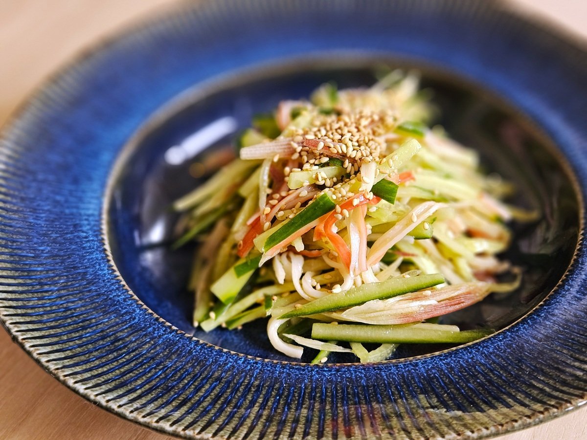 体内の塩分排出を助け、むくみや高血圧予防に役立つカリウム、抗酸化作用を持つアントシアニン、さらに食欲増進や疲労回復を助ける香り成分・アルファピネンなどが豊富に含まれているみょうが。食物繊維やビタミン、ミネラルも含み、健康サポートにも効果が期待できます。今回はみょうがときゅうりを千切りにし、カニカマを加えて満足感をプラスしたあっさりサラダをご紹介。夏が終わり、秋の訪れとともに体調を整えたい季節。冷やし中華風の味付けで、”冷やし中華が恋しいサラダ”と命名してみました!