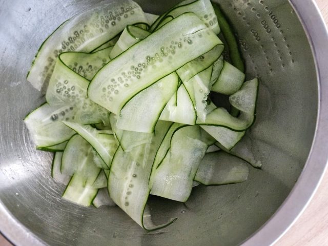 (1)きゅうりはピーラーでリボン状に。九条ねぎは小口切りに。