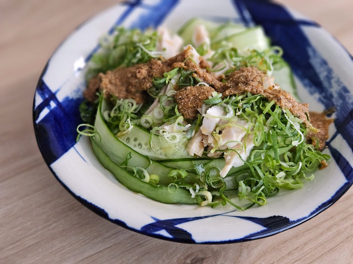 (4)皿にきゅうりとサラダチキン、九条ねぎを盛りつけ、(3)のドレッシングをかける。