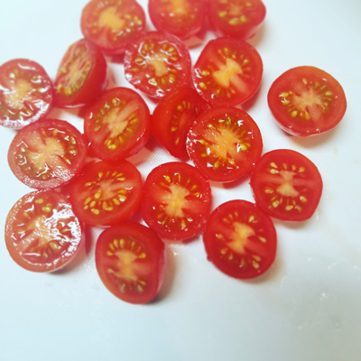 - 菜の花は食べやすい大きさに切り、新玉ねぎは薄切りにする。ミニトマトはヘタを取る。にんにくは粗みじんに切る。
