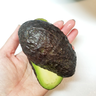 アボカドは縦半分にナイフを入れ、パカッと開いて種を取り除き、実に斜めに切れ込みを入れてスプーンですくって実を出す。