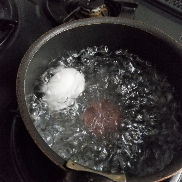 (1)ゆで卵を作る。沸騰して7~8分程度茹でて完熟にならない程度に。